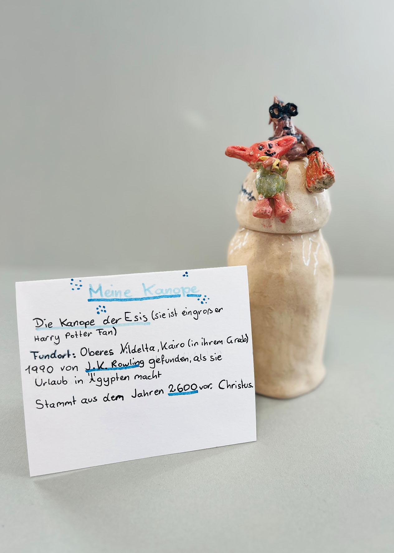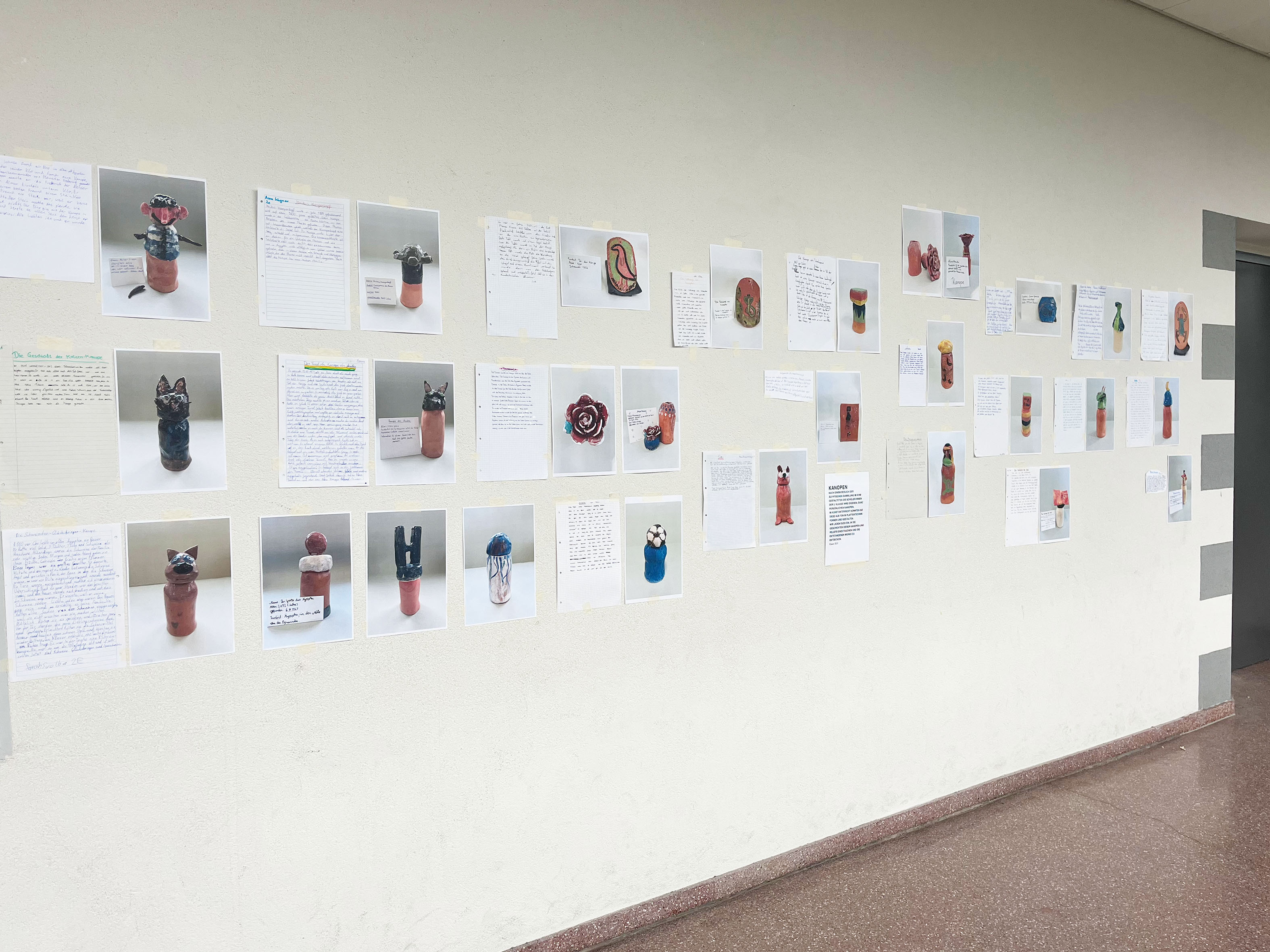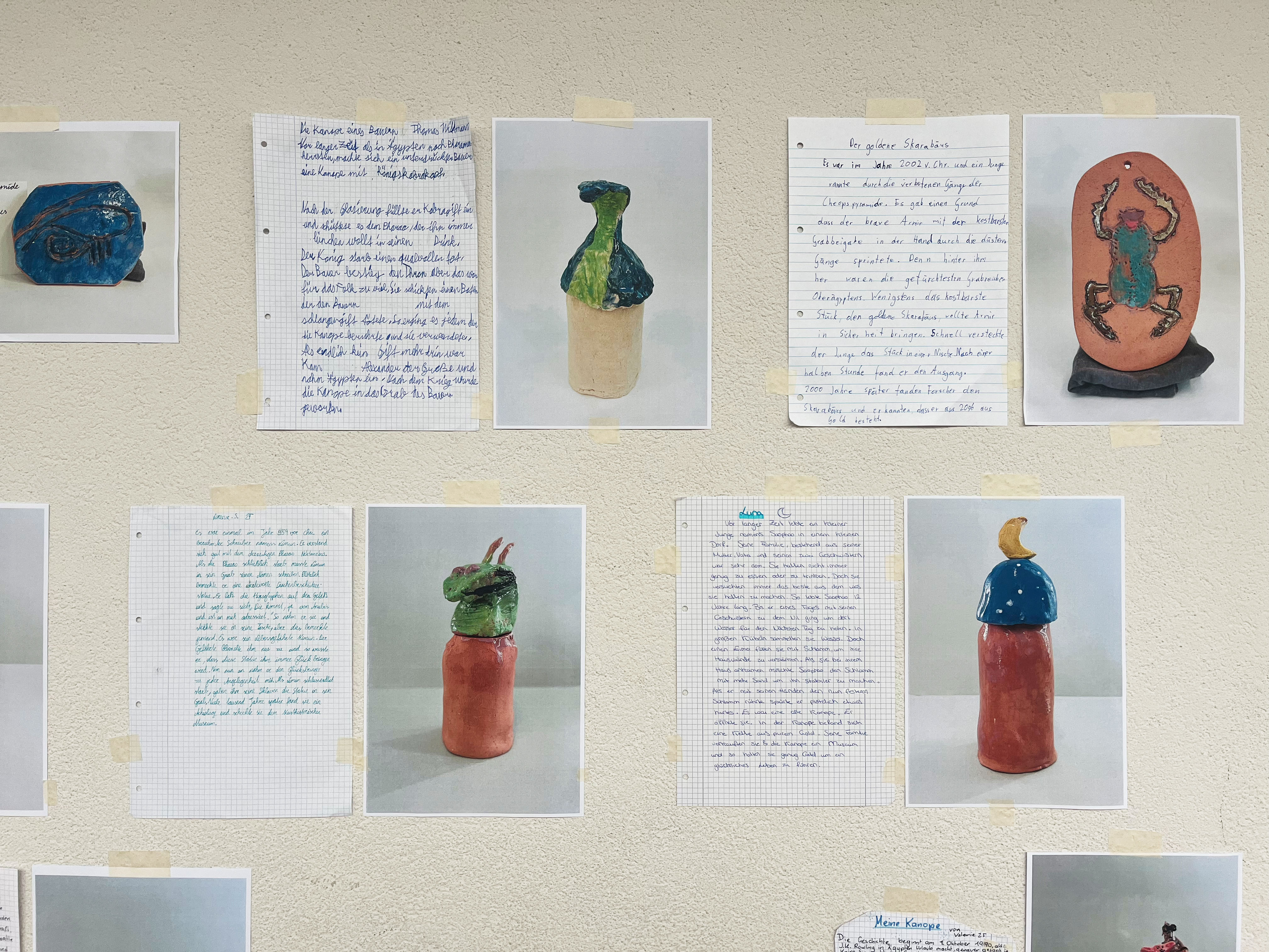 Im Anschluss wurden zu den Objekten Geschichten verfasst, Informationstafeln wie in einem Museum gestaltet und ganze Welten rund um die Kanopen erfunden – wie auf den Bildern zu sehen ist: von Isas, der ersten Schreiberin in Ägypten, über J. K. Rowling, die durch ihren „Fund“ zur Harry-Potter-Reihe inspiriert wurde, bis hin zur Minecraft-Kanope.