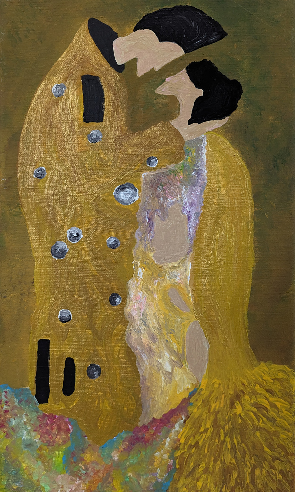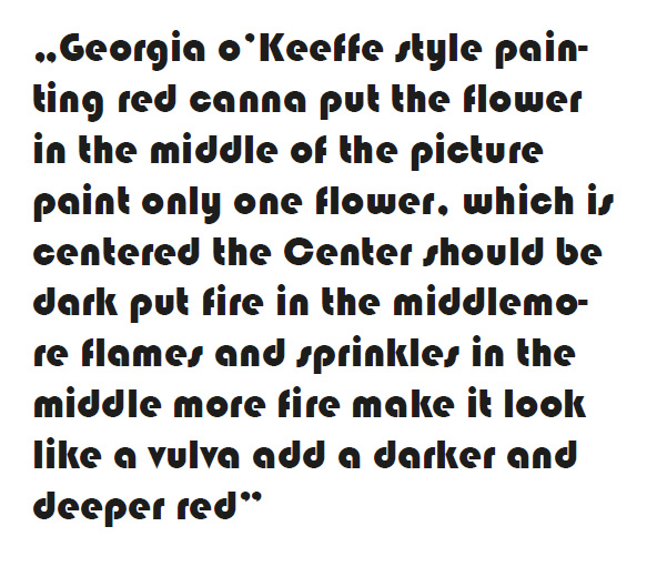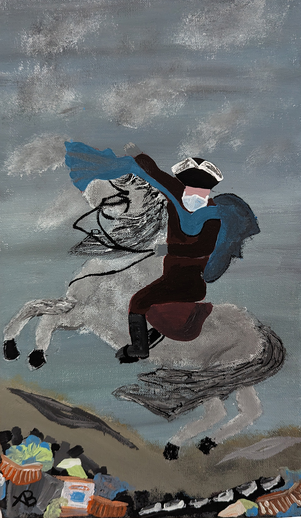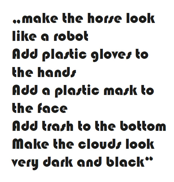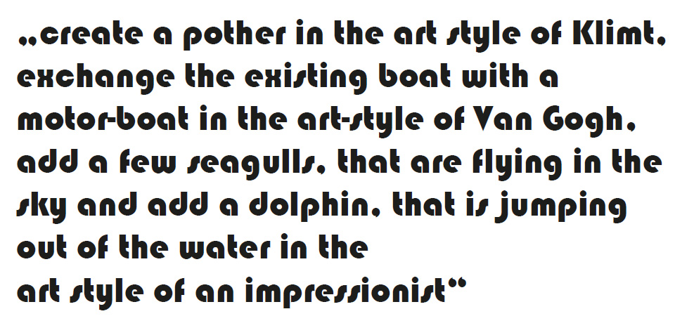 Im praktischen Teil der Arbeit wurde mithilfe von künstlicher Intelligenz durch einen Prompt ein Bild erzeugt. Dieses Bild diente als Vorlage für eine Malerei, die als „Rückfälschung“ auf Leinwand übertragen wurde. Stilistisch waren als Vorlage Kunstschaffende zu wählen, deren Werke inhaltlich auf, zu der damaligen Zeit aktuelle, gesellschaftliche oder politische Themen Bezug nehmen. Ausgehend von diesem Werk wurde der Stil aus dem historischen Kontext gerissen und auf gegenwärtige Krisen angewandt.