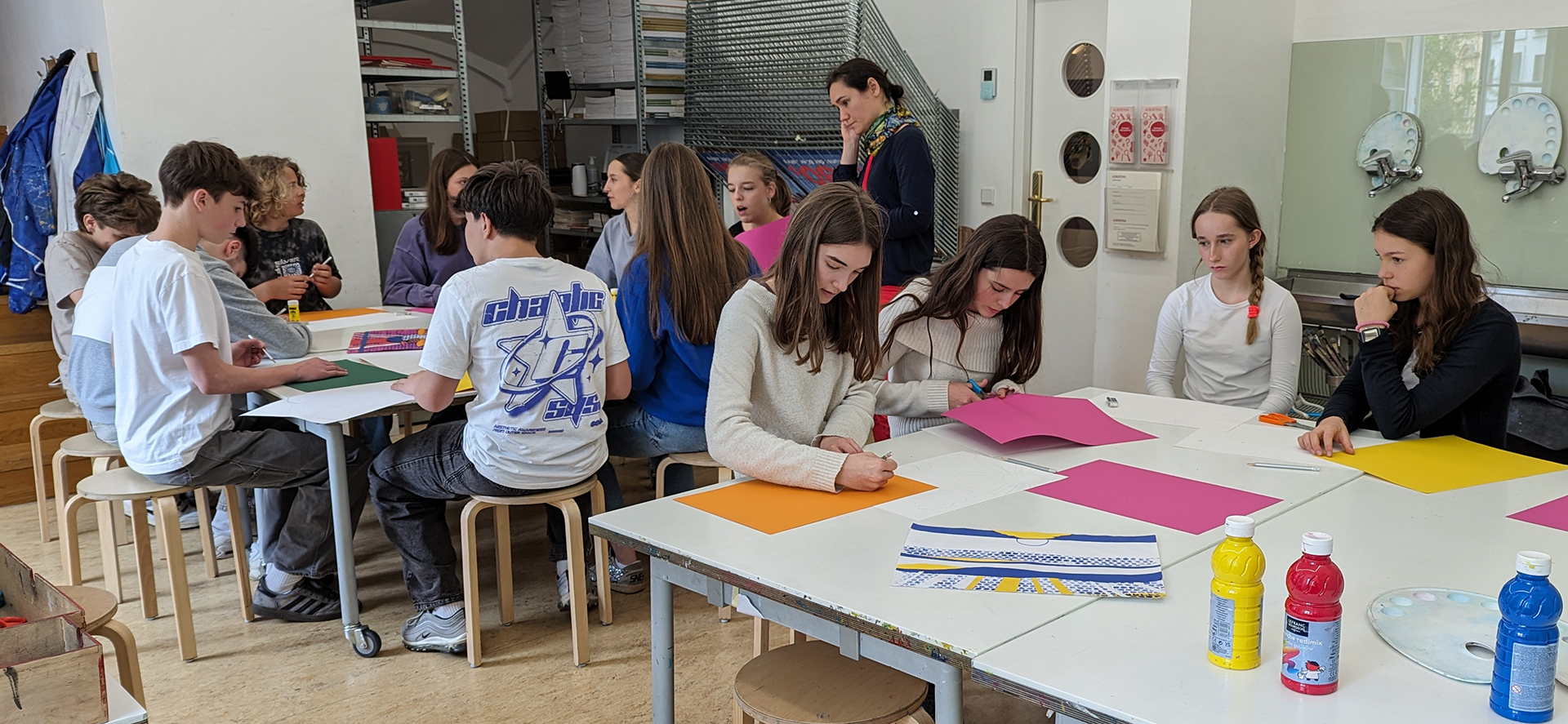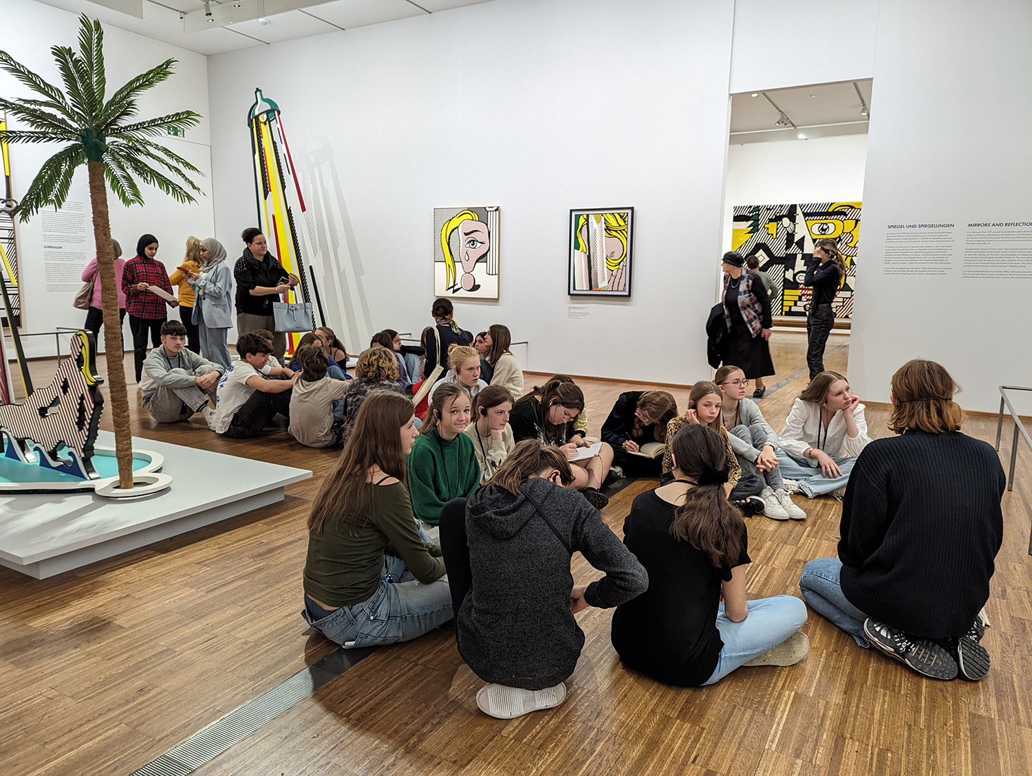 Anlässlich des hundertsten Geburtstages von Roy Lichtenstein findet derzeit in der Wiener Albertina eine große Ausstellung der Werke des Pop Art Künstlers statt. Die Schülerinnen und Schüler der 4e konnten die beinahe hundert Arbeiten, in denen sich Lichtenstein mit Konsumkultur und Massenmedien, Grafik, Comics und dem Kunstmarkt beschäftigt, kennenlernen. Im abschließenden Workshop wurden die Eindrücke von den Benday Dots, einem Markenzeichen des Künstlers, mit Luftpolsterfoliendruck zu Landschaftsbildern verarbeitet.