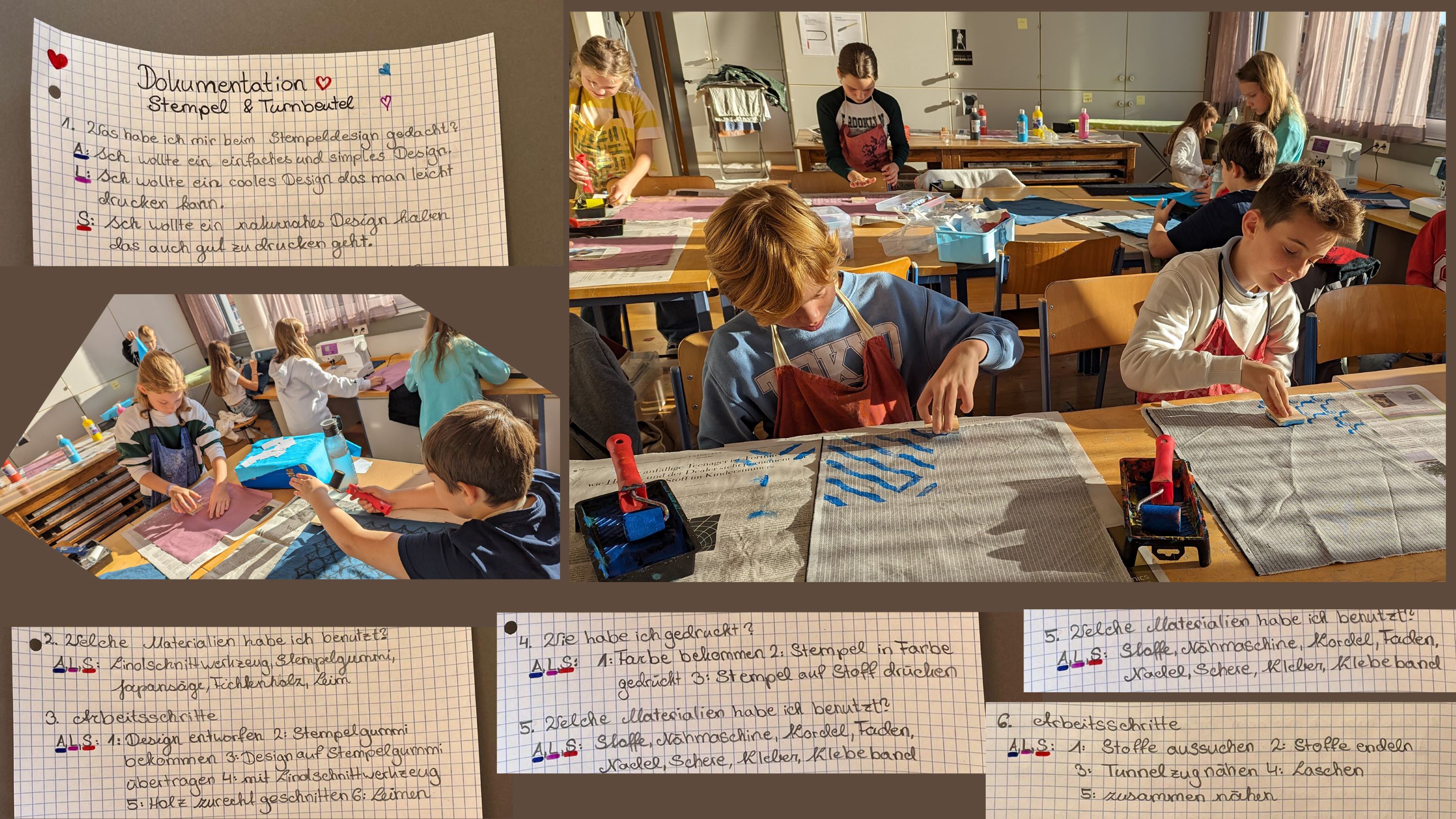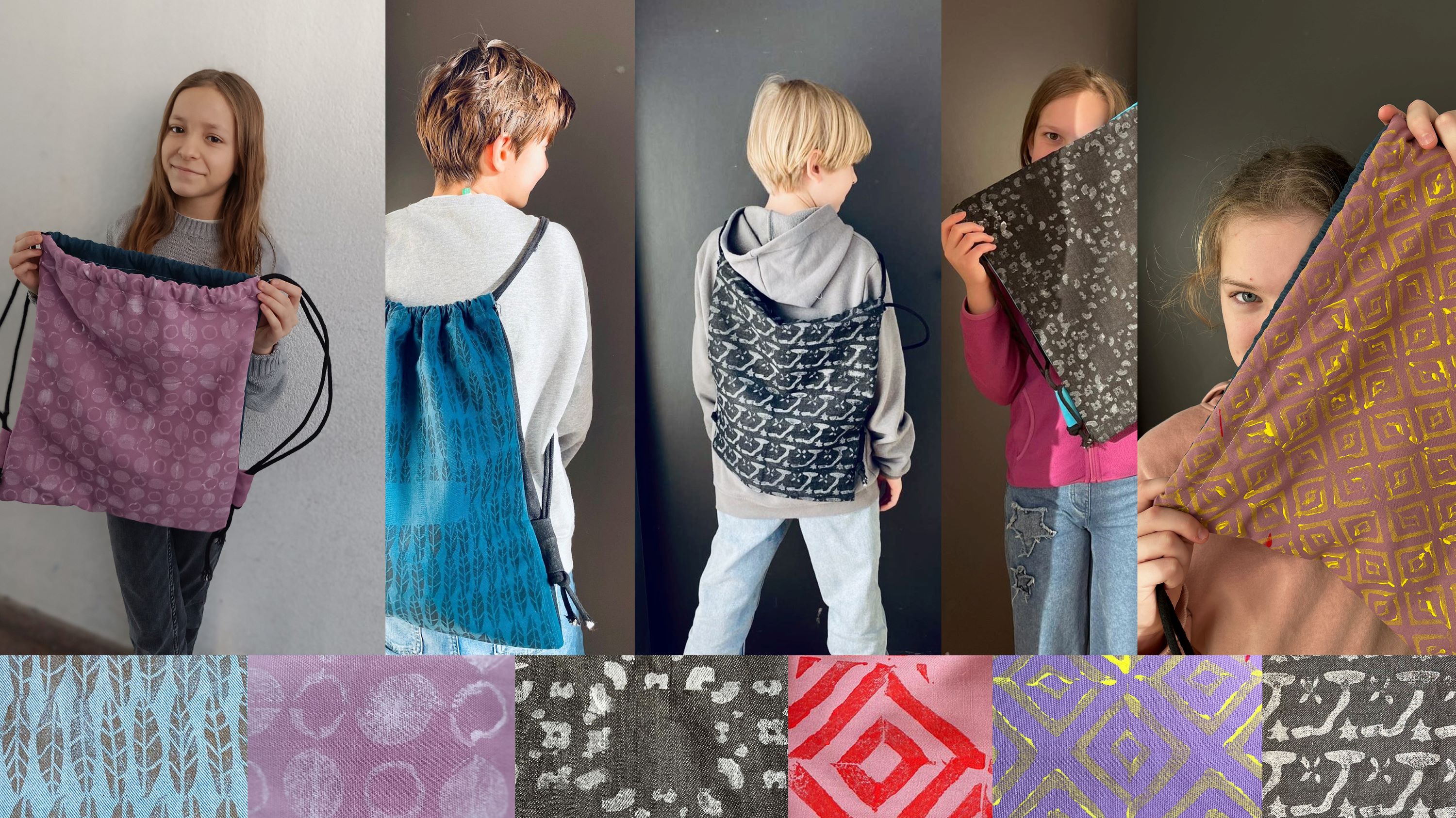 Vom Entwurf eines Motivs für den Druck im Rapportmuster, über die Herstellung handgefertigter Stempel aus Fichtenholz und Stempelgummi, bis zum Nähen der Sportbeutel wurden die unterschiedlichen Taschen auf ganz persönliche Weise gestaltet.