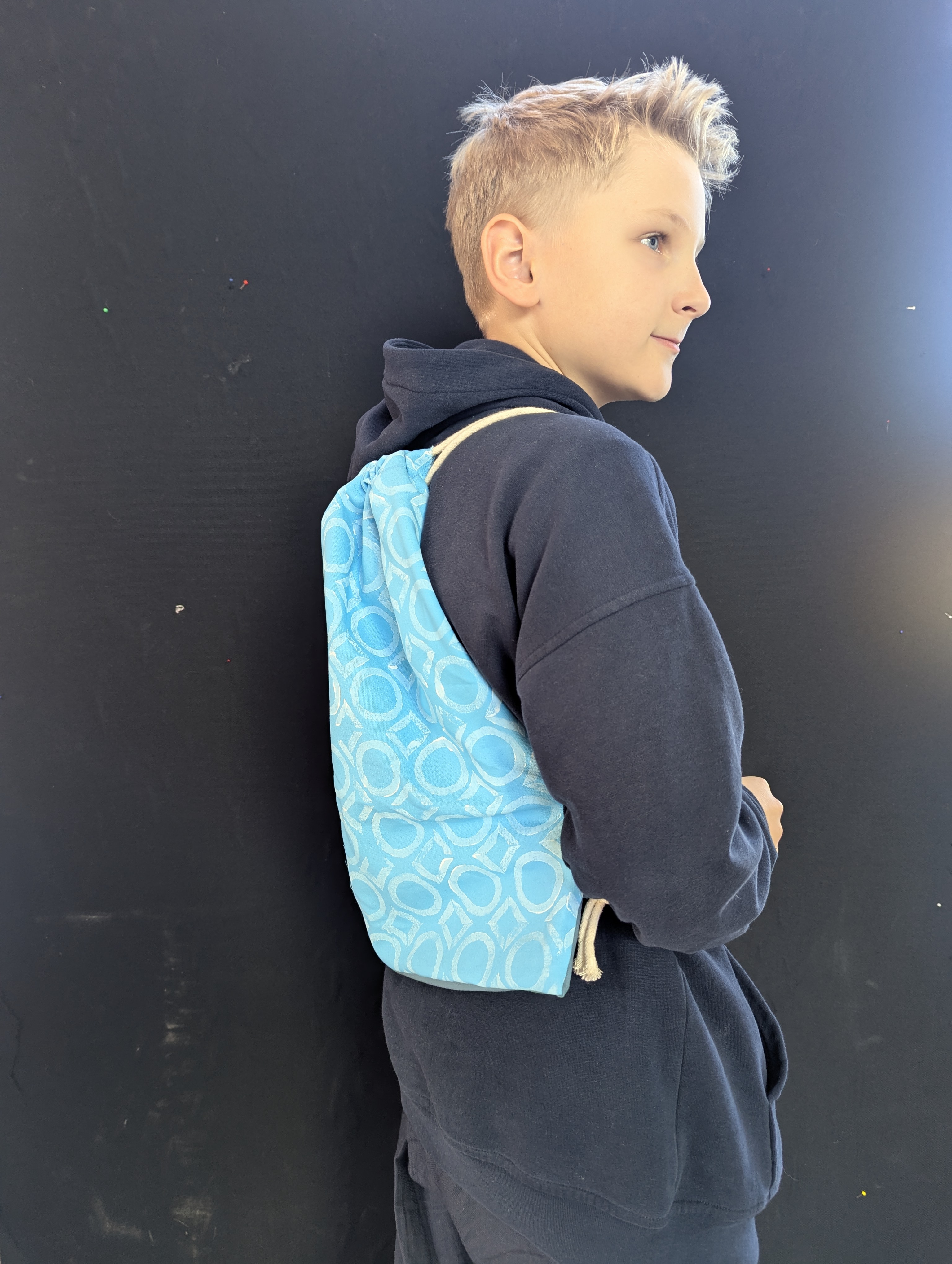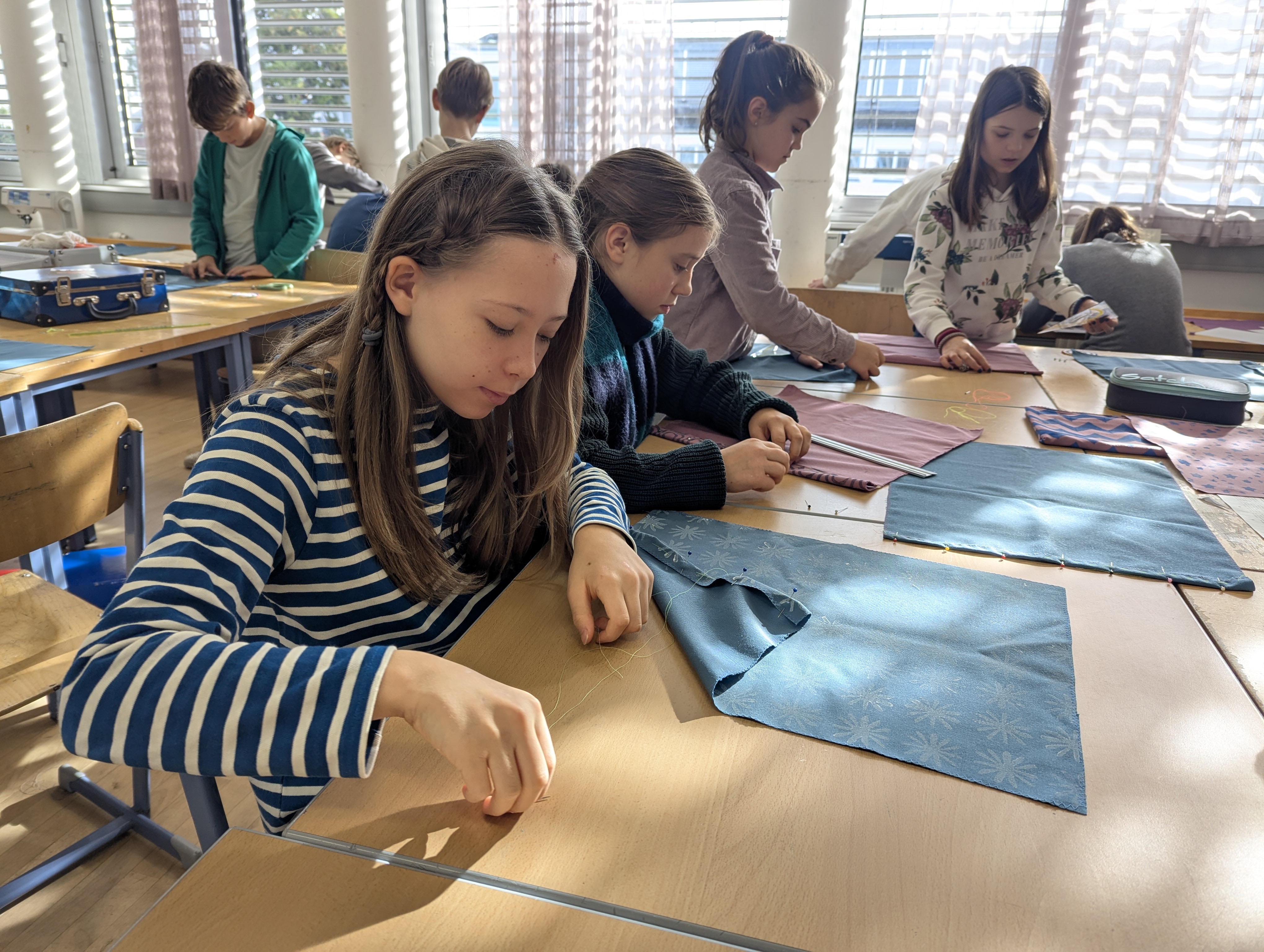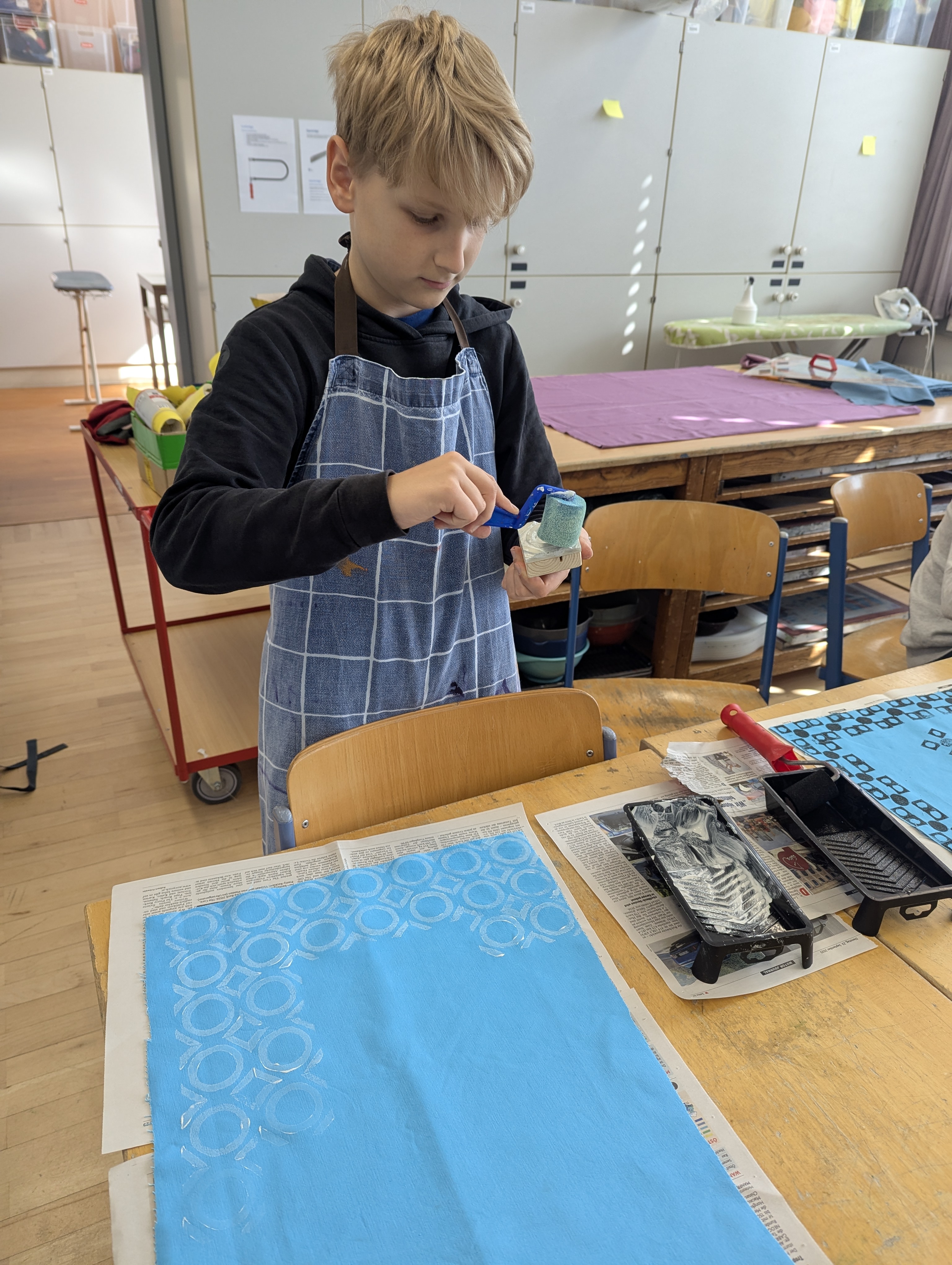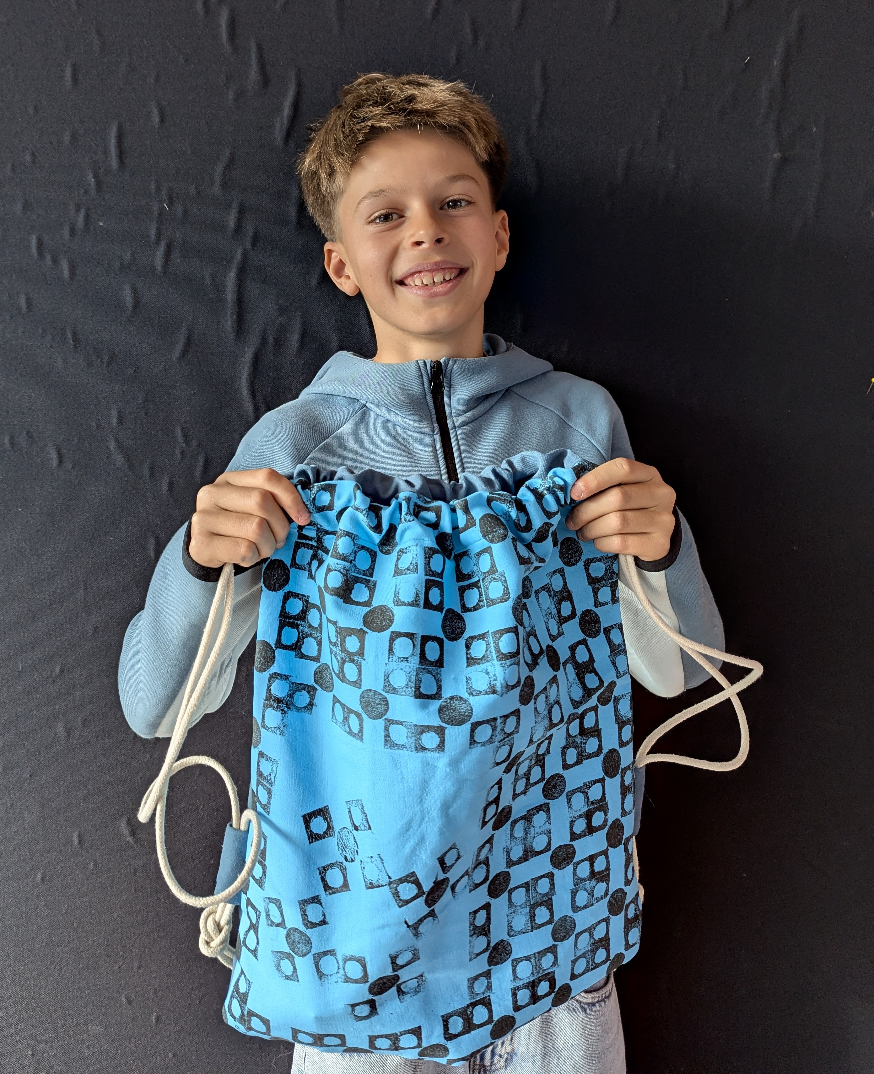 Beim Projekt "Sportbeutel" konnten die Schüler:innen der 2c und 2d das weite Spektrum von Technik und Design kennenlernen. Vorerst wurden Entwürfe für das Textildesign angefertigt. Anschließend wurden dafür Stempel aus Gummi geschnitten und mit einem Holzgriff versehen. Die Vorderseite der Stoffbahnen wurde im Rapportdruckverfahren bedruckt. Abschließend wurden aus den selbst designten Stoffen mithilfe der Nähmaschine Sportbeutel genäht.